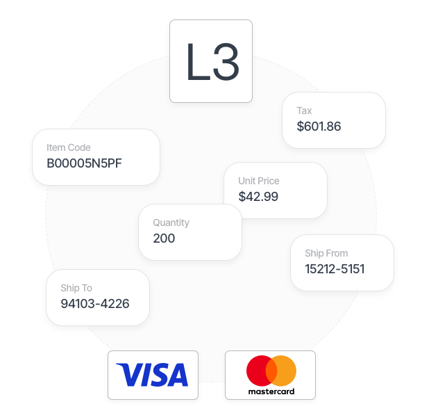 Our system is designed to help you capture the required Level 3 compliant transaction data, which goes far beyond the basic payment information collected in standard retail Level 1 transactions.